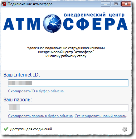 Удаленное подключение сотрудников компании Внедренческий центр "Атмосфера" к Вашему рабочему столу